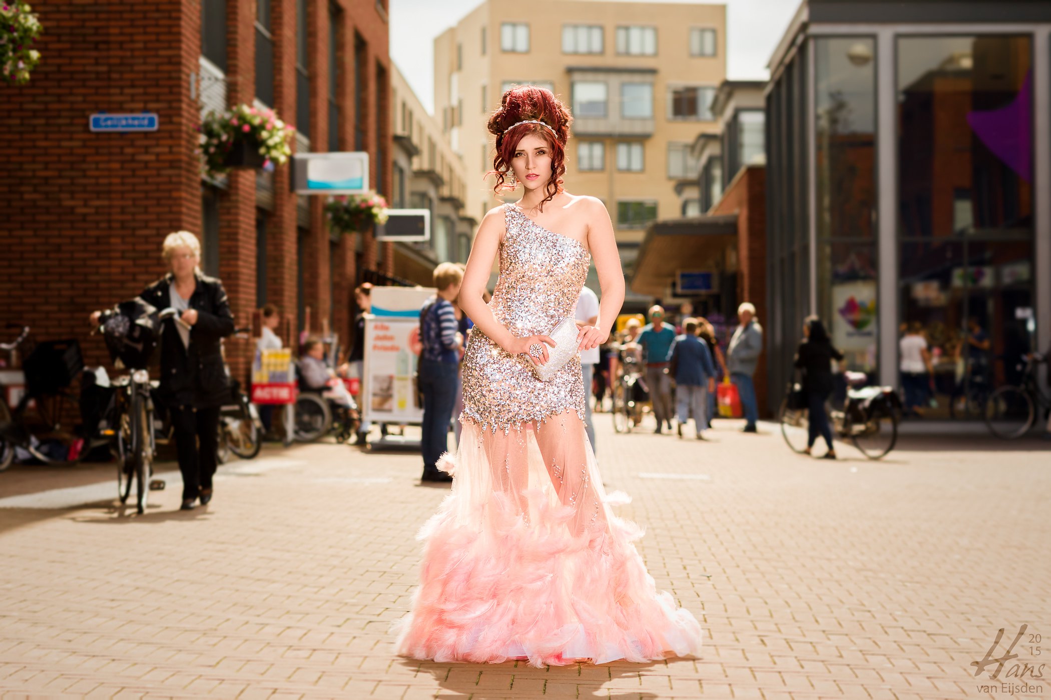 For this shoot I wanted to work full body and I wanted to experiment with the Maxi Spot, to see if it’s possible to light the full body with it by using it as a single point source, just like the sun. To make the concept even more complete we went for two beautiful special dresses, thanks Wens Fashion for supplying those and thanks Katia Spinetto for the makeup, the hair, the styling and the assistance with booming the Maxi Spot. The ELB 400 on her shoulder and the Maxi Spot with Pro Head on a boom arm gave her a good mobility, so we could walk on the middle of the street through the shopping centre while using beautiful flash. I measured for the ambient light with my Sekonic light meter, the sun was coming from behind, pointing over her shoulders, so I took the ambient exposure and lowered it with one stop. Then I used the ALB 400 with Maxi Spot to light Tamara until the right exposure (one stop above ambient) and I dialed it in in camera. While walking through the shopping centre, Katia had to keep the same distance between the Maxi Spot and Tamara, to keep the exposure consistent. And it worked beautifully, I had 0 missed pops and the color temperature was also spot on, every time. This saved me a lot of retouching work!